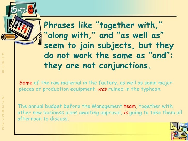 When a sentence compounds a positive and a negative subject and only one is plural, the verb should agree with the positive subject Words that indicate portions of a whole, such as "percent," "fraction," "some," "none," and "remainder" require a singular verb only if the object of the preposition is singularWhen as well as functions as a conjunction, it often leads to errors of agreement in number between subject and verb Ex Jack as well as his friends were invited to the party In the above sentence, the phrase as well as his friends is merely parenthetical;In other words, along with, as well as, and besides do not behave in the same way as the conjunction and when it comes to subjectverb agreement (even though they have roughly the same meaning or function) Content manager awelu @luse Feb 16, 11